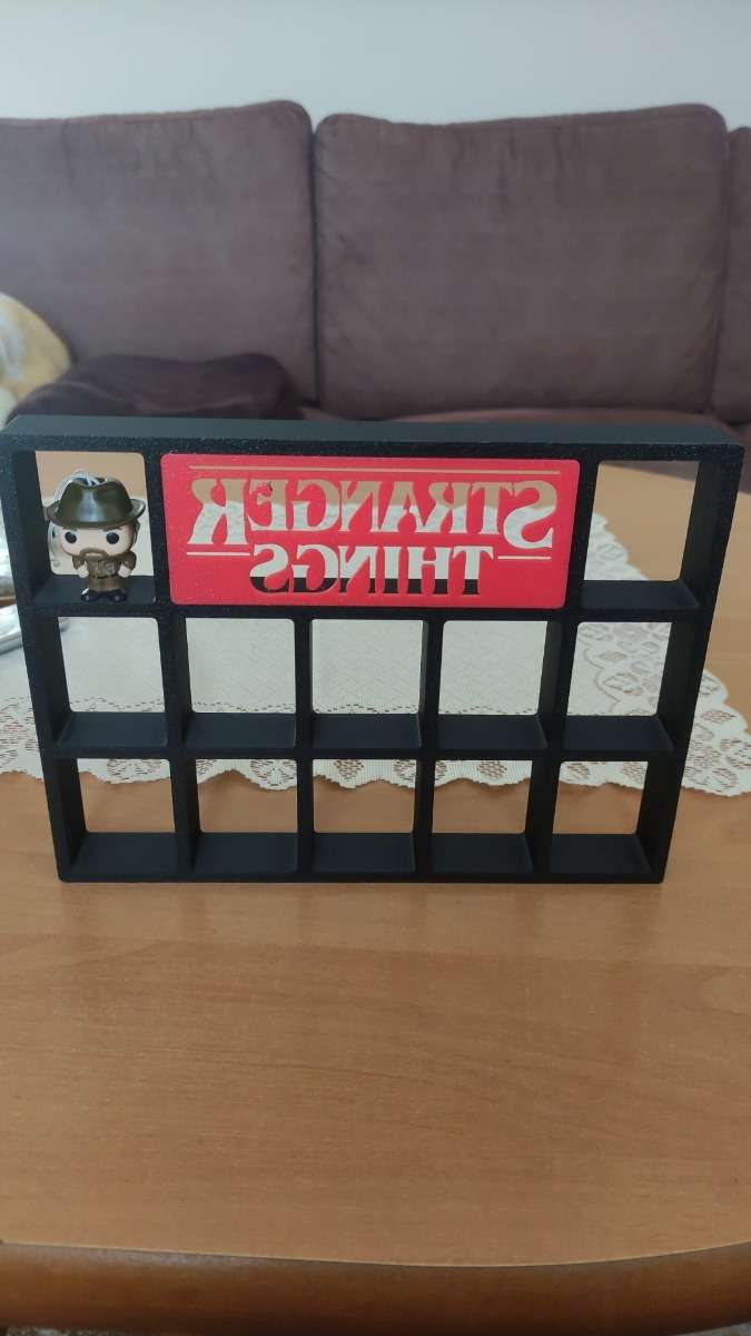 Зверху полицю увінчує великий об’ємний логотип Stranger Things на окремій панелі. Червоні літери на чорному фоні — фірмовий стиль серіалу, впізнаваний з першого погляду. Логотип виступає над корпусом і додає вітрині монументальності та характеру. Поруч із написом залишається місце для додаткових фігурок на верхній полиці 👑