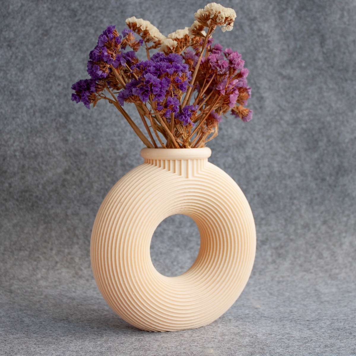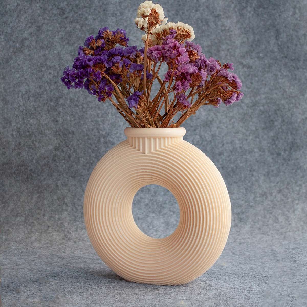 Ця сучасна петлева ваза – не просто посудина для квітів, а справжній арт-об’єкт для вашого дому. Її форма нагадує пончик, який стоїть на боці – з ідеальним отвором у центрі та витонченими концентричними полосками, що створюють візуальну динаміку й об’єм. Така геометрія виглядає органічно як у мінімалістичних, так і в сучасних інтер’єрах. Вона водночас ніжна й впевнена, незвичайна, але зрозуміла. Цей предмет інтер’єру змушує зупинити погляд та викликає емоцію ✨